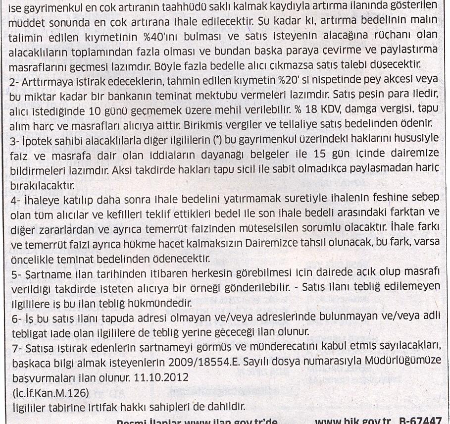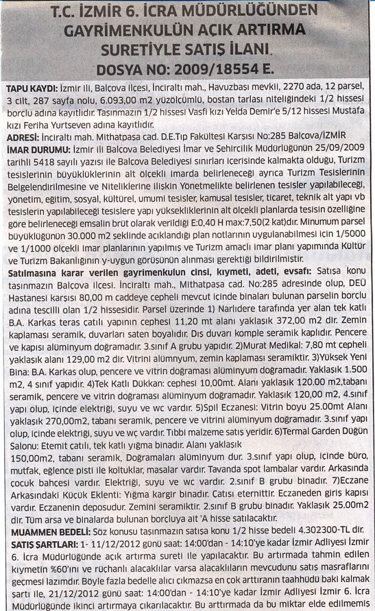 Satış 11 Aralık 2012 günü İzmir Adliyesi 6. İcra Müdürlüğü'nde saat 14.00'te gerçekleştirilecek.