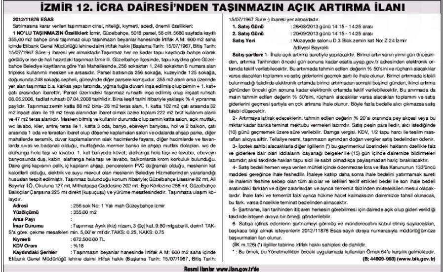 İzmir 12. İcra Dairesi tarafından satışa çıkarılan 355 metrekare arsa içinde yer alan villanın değeri 672 bin 500 lira olarak kayıtları girdi. Satış 26 Ağustos 2013 tarihinde saat 14.15'te Müzayede Salonu D 3 Blok Zemin kat No: Z 24 İzmir adresinde gerçekleştirilecek.