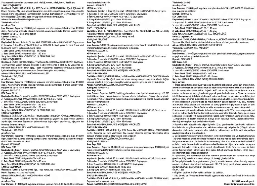 İzmir Karaburun Satış Memurluğu, 9 gayrimenkulü 820 bin 620 lira bedelle satışa çıkardı. Tahmini bedelleri 20 bin 660 lira ile 200 bin 850 lira arasında değişen taşınmazların ihalesi 6 Mayıs 2013 günü saat 10.10 ile 11.20 arası Karaburun Adliyesi'nde yapılacak. Alıcı çıkmaması durumunda ikinci satış 31 Mayıs 2013 günü aynı yer ve saatte gerçekleşecek.