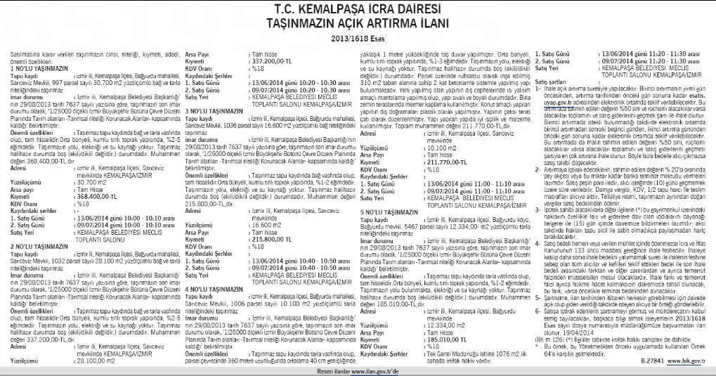Kemalpaşa İcra Dairesi'nin Bağyurdu Mahallesi'nde satışa çıkardığı 5 tarlanın toplam tahmini bedeli 1 milyon 318 bin 180 lira olarak açıklandı. Yüzölçümleri 10 bin 100 metrekare ile 30 bin 700 metrekare arasında değişen5 tarlanın ihalesi 13 Haziran 2014 günü saat 10:00 ile 11:30 arası Kemalpaşa Belediyesi Meclis Toplantı Salonu'nda açık artırma yöntemiyle gerçekleşecek. Alıcı çıkmaması durumunda ikinci ihaleler 9 Temmuz 2014 günü aynı yer ve saatte tekrarlanacak.