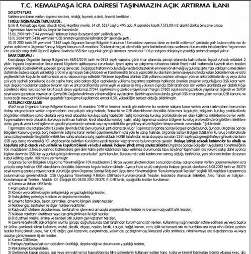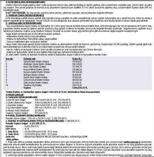 Kemalpaşa İcra Dairesi'nin Ulucak Köyü'nde satışa çıkardığı 7 bin 512 metrekare yüzölçüme sahip fabrika binası ve arsasının toplam tahmini bedeli 4 milyon 353 bin 209 lira olarak belirlendi. Satışa konu olan gayrimenkullerin ihalesi 25 Nisan 2014 günü saat 10:00 ile 10:15 arası Kemalpaşa Belediye Meclis Toplantı Salonu'nda gerçekleşecek. Alıcı çıkmaması durumunda ikinci satış 21 Mayıs 2014 günü aynı yer ve saatte tekrarlanacak.