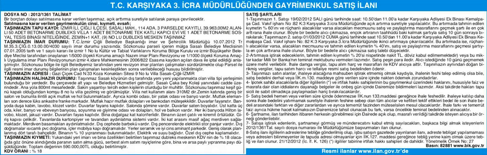 İzmir Karşıyaka 3. İcra Müdürlüğü, Çiğli sınırlarında kalan Koza Kozakları Sitesi'nde net kullanım alanı 310 metrekare olan dubleks villayı satışa çıkardı. Tahmini bedeli 590 bin lira olan villanın yıpranma payı yüzde 10 olarak belirlendi. KDV oranı yüzde 18 olarak açıklanan villanın ihalesi 19 Şubat 2012 Salı günü saat 10.50 ile 11.00 arası Karşıyaka 3. İcra Müdürlüğü'nde yapılacak. Alıcı çıkmaması durumunda ise ikinci satış 1 Mart Cuma günü aynı yer ve saatte gerçekleşecek.