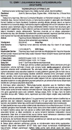 İzmir Sulh Mahkemesi, Bornova Ergene Mahallesi'nde 552,28 metrekare alana sahip taşınmazı 1 milyon 210 bin liraya satıyor. KDV oranı yüzde 1 olan taşınmazın ihalesi 4 Şubat 2014 tarihinde saat 14:00 ile 14:10 arası İzmir 7. Sulh Hukuk Mahkemesi kaleminde açık artırma usulü ile gerçekleştirilecek. İhaleye alıcı çıkmaması durumunda ikinci satış 4 Mart 2014 tarihinde saat 14:00 ile 14:10 arası aynı yer ve saatte yapılacak.