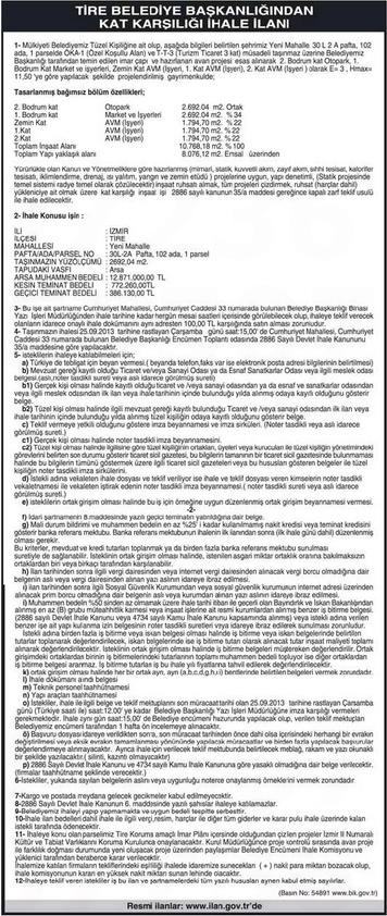 İzmir Tire Belediyesi 10 bin 768 metrekare inşaat alanına sahip AVM yaptıracak. Toplam yapı alanı 8 bin 76 metrekare olarak belirlenen AVM'nin inşa edileceği arsanın tahmini bedeli 12 milyon 871 bin lira, geçici teminatı ise 386 bin 130 lira olarak belirlendi. İhale 25 Eylül 2013 günü saat 15.00'te Tire Belediyesi'nde gerçekleştirilecek.