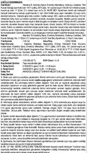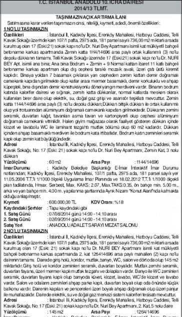 İstanbul Anadolu İcra Dairesi tarafından Kadıköy Erenköy Mahallesi'nde satışa çıkarılan 60 metrekare dükkan ile 145 metrekarelik dairenin toplam tahmini fiyatı 1 milyon 300 bin lira olarak kayıtlara geçti. Söz konusu gayrimenkullerin ihalesi 7 Ağustos 2014 günü saat 14:00 ile 14:30 arası Anadolu Adalet Sarayı'nda açık artırma yöntemiyle gerçekleştirilecek. Alıcı çıkmadığı takdirde ikinci ihale 2 Eylül 2014 günü aynı yer ve saatte tekrarlanacak.