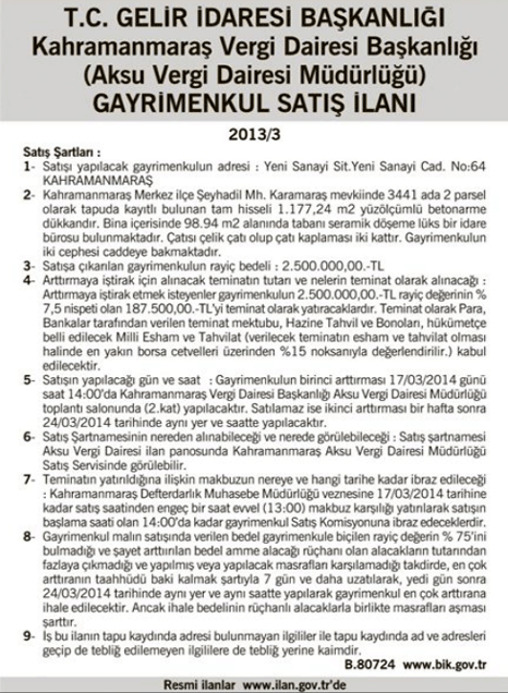 Kahramanmaraş Vergi Dairesi Başkanlığı Şeyhadil Mahallesi Karamaraş mevkiinde satışa çıkardığı bin 177 metrekare yüzölçüme sahip dükkanı satışa çıkardı. Tahmini bedeli 2 milyon 500 bin lira olan taşınmazın teminat bedeli ise 187 bin 500 lira olarak belirlendi. Satışa konu olan gayrimenkullerin birinci ihalesi 17 Mart 2014 günü saat 14.00'te, Kahramanmaraş Vergi Dairesi Başkanlığı'nda gerçekleşecek. Alıcı çıkmaması durumunda ikinci satış 24 Mart 2014 günü aynı yer ve saatte tekrarlanacak.
