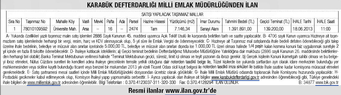 Karabük Defterdarlığı, Üniversite Mahallesi'nde 7 bin 146 metrekarelik sanayi imarlı arsayı satışa çıkardı. Tahmini bedeli 1 milyon 391 bin 891 lira olan arsanın geçici teminat bedeli 139 bin 200 lira olarak belirlendi. İhale 18 Haziran 2013 günü saat 11.00'de yapılacak.