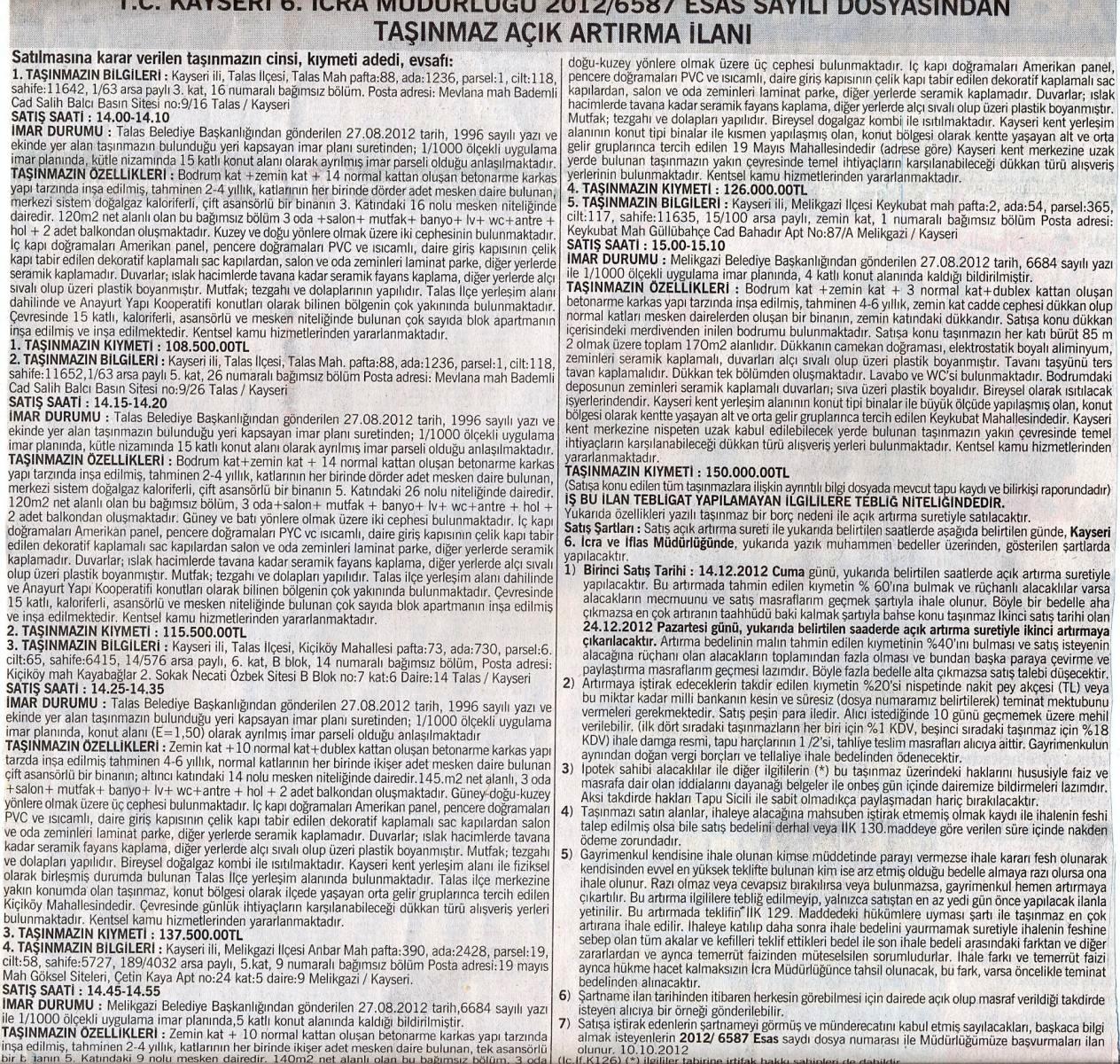 Kayseri 6. İcra Dairesi, 5 gayrimenkulü toplamda 637 bin 500 lira tahmini bedelle satışa çıkardı. Tahmini bedelleri 108 bin 500 lira ile 150 bin lira arasında değişen taşınmazların ihalesi 14 Aralık 2012 Cuma günü 14.00 ile 15.10 arası Kayseri 6. İcra Dairesi'nde yapılacak. Alıcı çıkmaması durumunda ikinci satış 24 Aralık 2012 günü aynı yer ve saatte gerçekleşecek.
