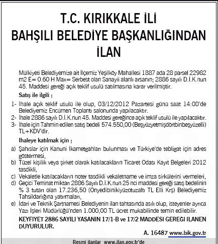 Kırıkkale Bahşılı Belediyesi, sanayi imarlı arsayı 574 bin 550 lira tahmini bedelle satışa çıkardı. KDV hariç olarak satılacak arsanın geçici teminat bedeli ise 17 bin 236 lira. Satışa çıkarılan arsanın ihalesi 3 Aralık 2012 Pazartesi günü saat 14.00'te Bahşılı Belediyesi Encümen Salonu'nda yapılacak.