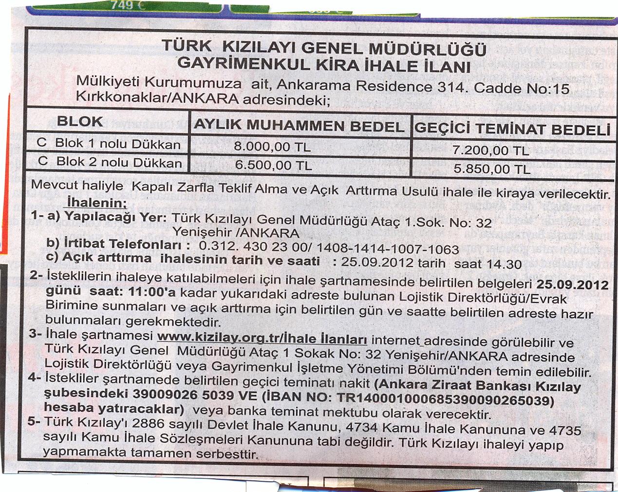 Kızılay, Ankarama Residence’daki iki dükkanını kiraya veriyor. Aylık tahmini kira bedelleri 6 bin 500 lira ile 8 bin lira arasında değişen dükkanların ihalesi 25 Eylül 2012 günü saat 14.30’da yapılacak