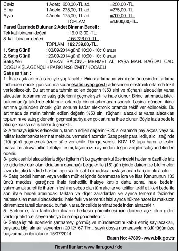 Kocaeli 1. İcra Dairesi, Kocaeli Kartepe, Sarımeşe Köyü'nde yer alan 1 adet tek katlı kargir bina ile 1 adet 3 katlı karkas bina, arsa ve 22 ağacı 1 milyon 287 bin 339 lira bedel ile satışa çıkardı. Söz konusu taşınmazın ihalesi 3 Eylül 2014 günü saat 10.0-10.10 arasında Kocaeli 1. İcra Dairesi'nde gerçekleştirilecek. Alıcı çıkmaması durumunda ise 2. Satış 29 Eylül 2014 günü belirtilen saat aralığında yapılacak.