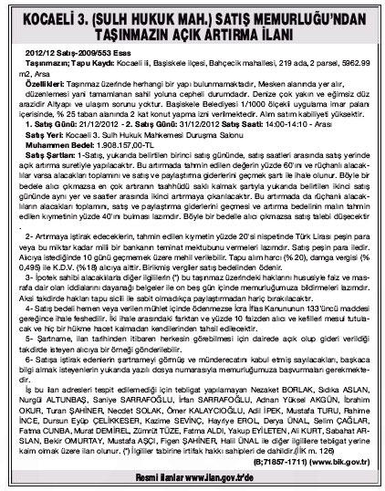 Kocaeli 3. Sulh Hukuk Mahkemesi Satış Müdürlüğü, Kocaeli Başiskele ilçesi, Bahçecik Mahallesi'nde bulunan 5.962,99 metrekarelik arsayı 21 aralık 2012 tarihinde saat 14.00'te Kocaeli 3 sulh Huku Mahkemesi Duruşma Salonu'nda yapılacak açık artırma ile satacak. Alıcı çıkmaması durumunda ikinci oturum 31 Aralık 2012 tarihinde aynı saatte ve yerde yapılacak. Arsanın muhammen bedeli 1 milyon 908 bin 157 TL olarak belirlendi.