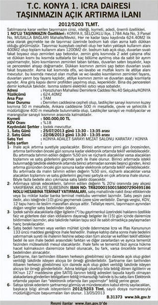 Konya 1. İcra Dairesi, 624 metrekare alana sahip dükkanı 500 bin lira tahmini bedelle satışa çıkardı. KDV'si yüzde 18 olan dükkanın ihalesi 25 Temmuz 2013 günü saat 13.30 ile 13.35 arası Konya Adalet Sarayı'nda gerçekleştirilecek. Alıcı çıkmaması durumunda ikinci satış 22 Ağustos 2013 günü aynı yer ve saatte gerçekleştirilecek.