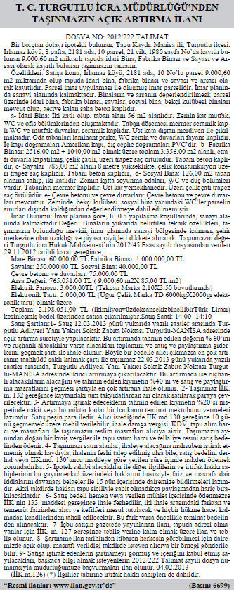 Manisa Turgutlu İcra Müdürlüğü, Irlamaz köyü sınırlarında kalan 9 bin metrekarelik arsayı ve üzerindeki fabrikayı toplamda 2 milyon 198 bin lira tahmini bedelle satışa çıkardı. Arsa değeri 765 bin 51 lira olan taşınmazın ihalesi 12 Mart 2013 günü saat 14.00 ile 14.10 arası Turgutlu Adliyesi'nde yapılacak. Alıcı çıkmaması durumunda ikinci satış 22 Mart 2013 günü aynı yer ve saatte gerçekleşecek.