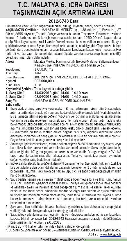 Malatya 6. İcra Dairesi, Malatya ili, Merkez ilçesi, 1385 ada, 1 parselde bulunan taşınmazı ihale ile satacak. Yüzölçümü 1.058,91 metrekare olan işyeri vasıflı taşınmazın muhammen bedeli 602 bin TL olarak belirlendi. İhale, 14.03.2013 tarihinde saat 14.00'te Malatya 6. İcra Müdürlüğü kaleminde yapılacak.