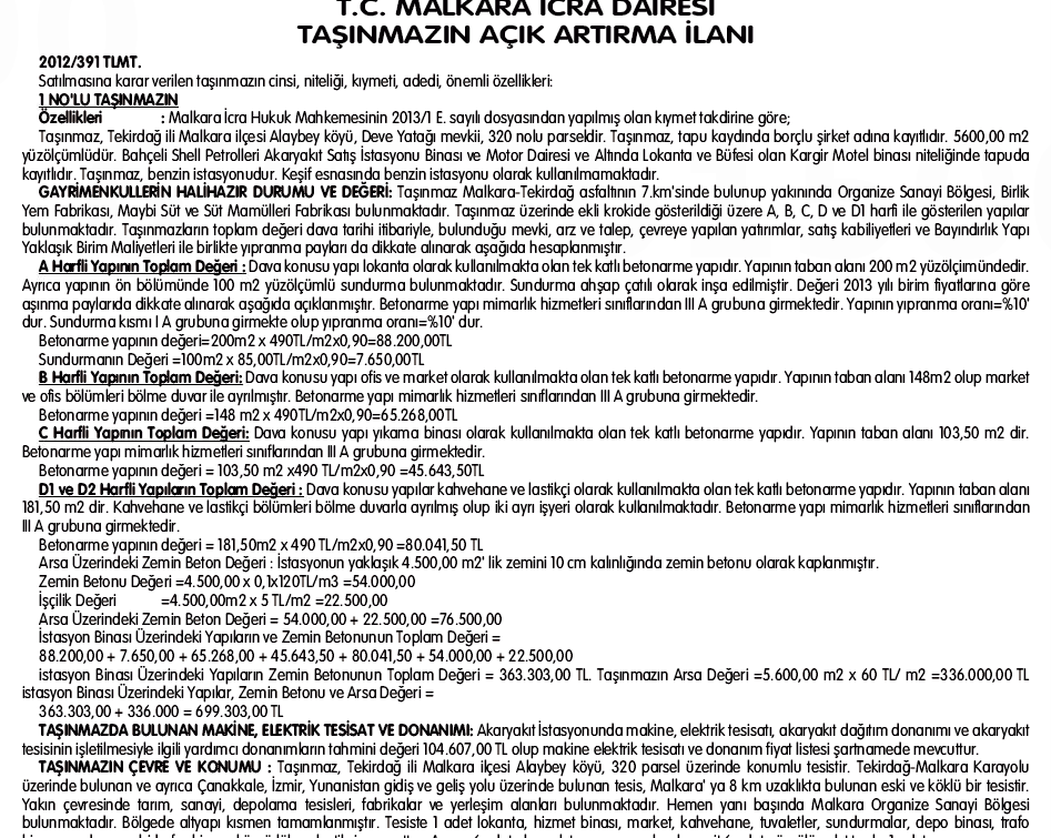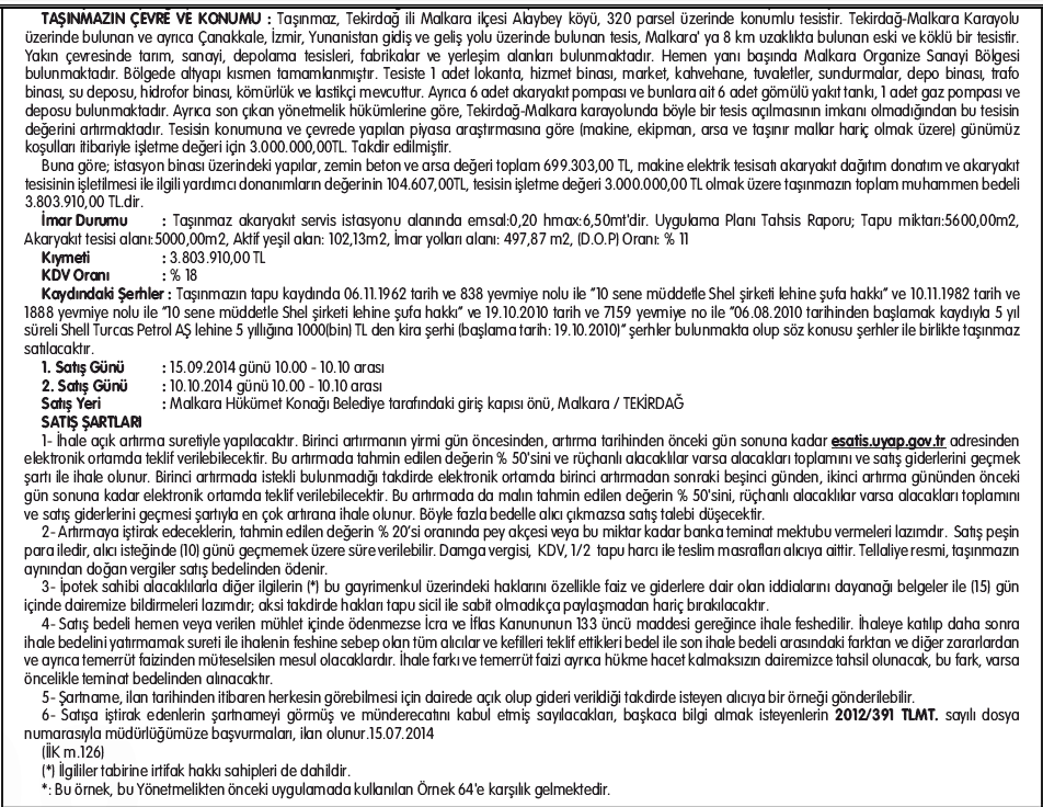 Malkara İcra Dairesi'nin Alaybey Köyü'nde satışa çıkarılan 320 nolu parseldeki akaryakıt istasyon binası, motor dairesi, ve altında lokantası olan kargir motel binanın toplam tahmini fiyatı 3 milyon 803 bin 910 lira olarak kayıtlara geçti. Shell Petrolleri olarak açıklanan akaryakıt istasyonu binası ve diğer gayrimenkullerin ihalesi 15 Eylül 2014 günü saat 10:00 ile 10:10 arası Malkara Hükümet Konağı'nda açık artırma yöntemiyler gerçekleşecek. Alıcı çıkmaması durumunda ikinci satış 10 Ekim 2014 günü aynı yer ve saatte tekrarlanacak.