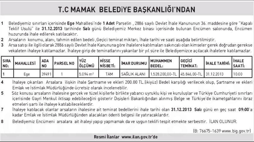 Mamak Belediyesi sınırlarında bulunan Ege Mahallesi'nde sağlık alanı imarlı taşınmaz satıyor. Taşınmazın tahmini bedeli 1 milyon 528 bin 200 bin lira, geçici teminat bedeli ise 45 bin 846 liradır. KDV'si yüzde 18 olan taşınmazın ihalesi 31 Aralık 2013 tarihinde saat 10:00'da Mamak Belediyesi merkez binası içerisinde bulunan Encümen salonunda kapalı teklif usulü ile gerçekleştirilecek.