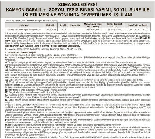 Soma Belediyesi'nin Manisa İstasyon Mahallesi'nde üst kullanım hakkı verdiği 21 bin 723 metrekare yüzölçüme sahip garaj ve sosyal tesis binasının tahmini bedeli 1 milyon 834 bin 840 lira, geçici teminat bedeli ise 55 bin 45 lira olarak belirlendi. Soma Belediyesi İstasyon Mahallesi'nde sosyal tesis ve garajı 30 yıllığına üst kullanım hakkı veriyor. Soma İstasyon Mahallesi'nde 30 yıllığına üst kullanım hakkı verilen 21 bin 723 metrekarelik alanın ihalesi 27 Şubat 2014 günü saat 14:00'da Soma Belediye Encümen toplantı salonunda gerçekleşecek.