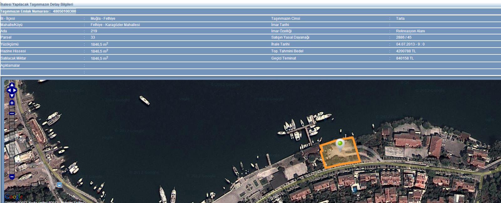 Milli Emlak, Muğla'nın Fethiye ilçesinde arsa satıyor. 1846 metrekare büyüklüğe sahip arsa denizin hemen yanında konumlanıyor. Tahmini bedeli 4 milyon 200 bin 788 lira olarak belirlenen taşınmazın geçici teminatı 840 bin 158 lira olarak belirlendi. İhale 4 Temmuz 2013 günü saat 9.00'da gerçekleştirilecek.