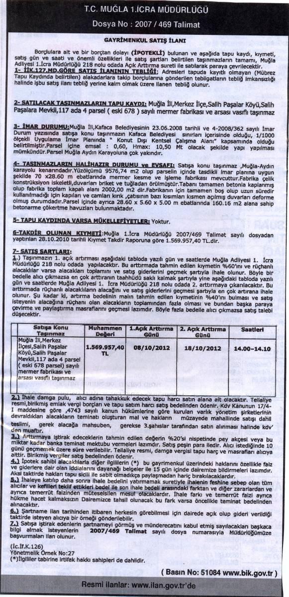 Muğla 1. İcra Müdürlüğü, kenti merkezinde yer alan mermer fabrikası ve arsasını satışa çıkardı. Muğla merkezdeki mermer fabrikası için 1 milyon 569 bin 957 lira tahmini fiyat belirleyen Muğla 1. İcra Müdürlüğü, ilk satışı 8 Ağustos 2012, ikinci satışı ise 18 Ağustos 2012 tarihinde Muğla Adliyesi'nde gerçekleştirecek.