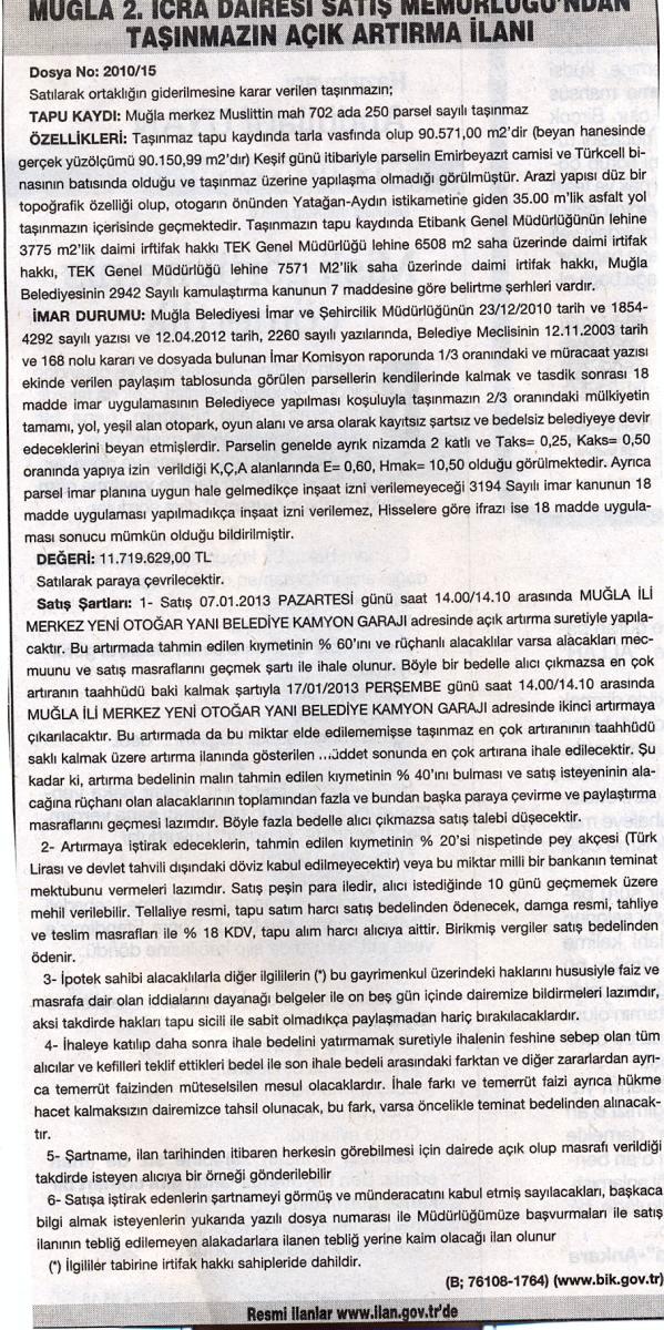 Muğla merkezde icradan satıya çıkarılan tarla 90 bin 571 metrekare kullanım alanına sahip bulunuyor. Üzerinde her hangi bir yapılaşmanın yer almadığı tarlanın değeri 11 milyon 719 bin lira olarak kayıtlara geçti. Tarlanın satışı 7 Ocak 2013 tarihinde saat 14.00'te gerçekleştirilecek.