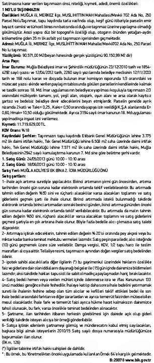 Muğla Satış Memurluğu, Merkez içerisinde yer alan 90 bin 571 metrekarelik arsayı satışa çıkardı. Tahmini bedeli 11 milyon 719 bin 629 lira olan arsanın KDV'si yüzde 18. Muslihittin Mahallesi sınırlarında kalan arsanın ihalesi 24 Mayıs 2013 günü saat 10.00 ile 10.10 arası Muğla Adliyesi'nde yapılacak. Alıcı çıkmaması durumunda ikinci satış 18 Haziran 2013 günü aynı yer ve saatte gerçekleşecek.
