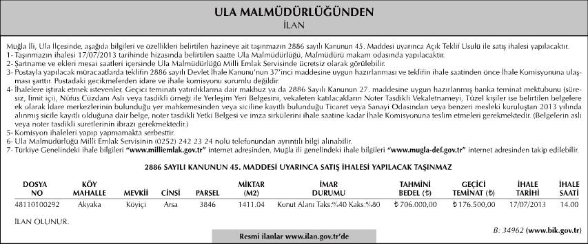 Muğla Ula Malmüdürlüğü, Akyaka bölgesi sınırlarında kalan 1411 metrekarelik konut imarlı arsayı satışa çıkardı. Tahmini bedeli 706 bin lira olarak belirlenen taşınmazın geçici teminat bedeli 176 bin 500 lira olarak açıklandı. İhale 17 Temmuz 2013 günü saat 14.00'te yapılacak.