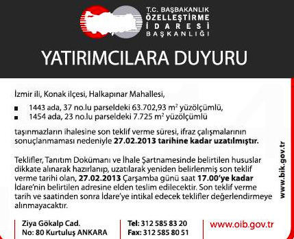 Özelleştirme İdaresi Başkanlığı (ÖİB) tarafından İzmir Konak'ta satışa çıkarılan 63 bin 702 metrekare ve 7 bin 725 metrekarelik iki arsanın başvuru süresi 27 Şubat'a kadar uzatıldı. Halkapınar Mahallesi sınırlarında kalan arsalar için son teklif verme tarihi 27 Şubat 2013 saat 17.00 olarak belirlendi.