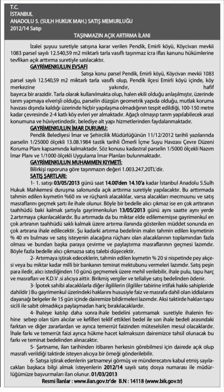Anadolu (5. Sulh Hukuk Mah.) Satış Memurluğu, Pendik, Emirli Köyü, Köycivan mevkiinde bulunan 12.540,59 metrekarelik tarlayı ihale ile satacak. Gayrimenkulün muhammen bedeli 1.003.247,20 TL olarak belirlendi. İhale, 03.05.2013 günü saat 14.00'te İstanbul Anadolu 5. Sulh Hukuk Mahkemesi duruşma salonunda yapılacak.