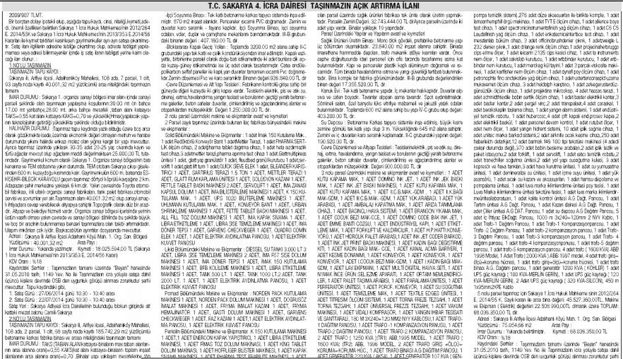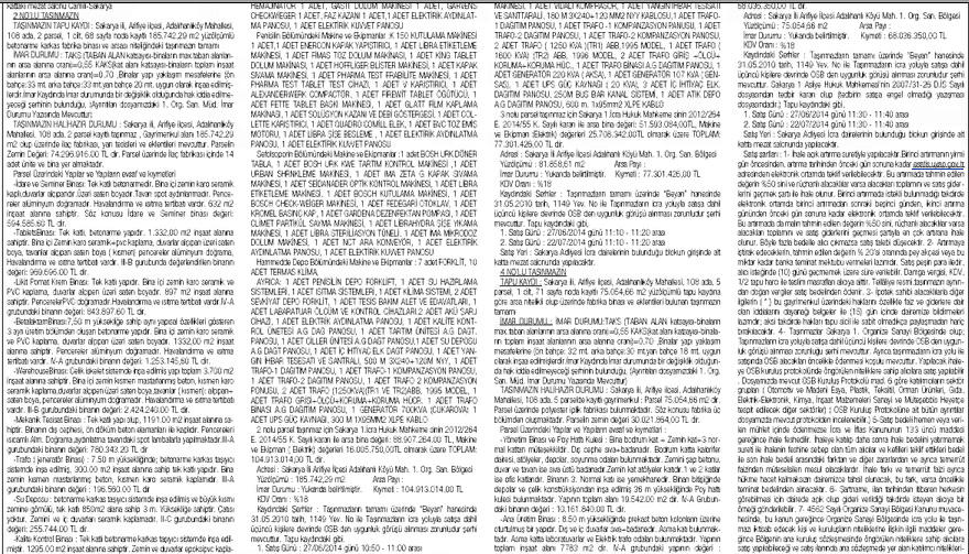 Sakarya 4. İcra Dairesi'nin Arifiye Adalıhanköyü'nde satışa çıkardığı 3 fabrika binası ile arsasını ve 1 adet sanayi arazisinin toplam tahmini fiyatı 268 milyon 276 bin 384 lira olarak kayıtlara geçti. Yüzölçümleri 40 bin metrekare ile 185 bin 742 metrekare arasında değişen gayrimenkullerin ihalesi 27 Haziran 2014 günü saat 10:30 ile 11:40 arası Sakarya Adliyesi'nde açık artırma yöntemiyle gerçekleşecek. Alıcı çıkmaması durumunda ikinci satış 22 Temmuz 2014 günü aynı yer ve saatte tekrarlanacak.