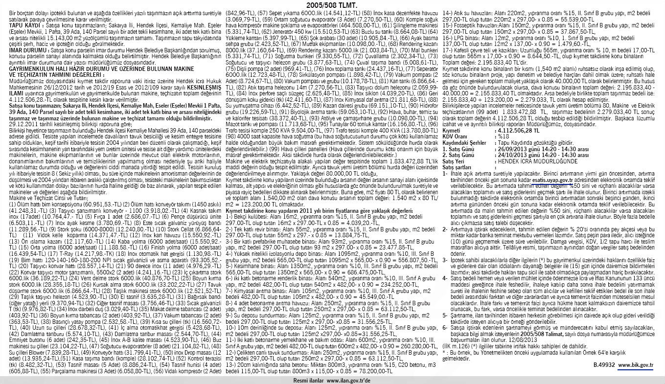 Sakarya Hendek İcra Dairesi 15 bin 143 metrekarelik arsa ile birlikte kesimhane ve iki adet bina satıyor. Toplam tahmini bedeli 4 milyon 112 bin 506 lira olarak belirlenen taşınmazların KDV'si yüzde 18 olarak belirlendi. İhale 26 Eylül 2013 günü saat 14.20 ile 14.30 arası Hendek İcra Müdürlüğü'nde gerçekleştirilecek. Alıcı çıkmaması durumunda ikinci satış 24 Ekim 2013 günü aynı yer ve saatte yapılacak.