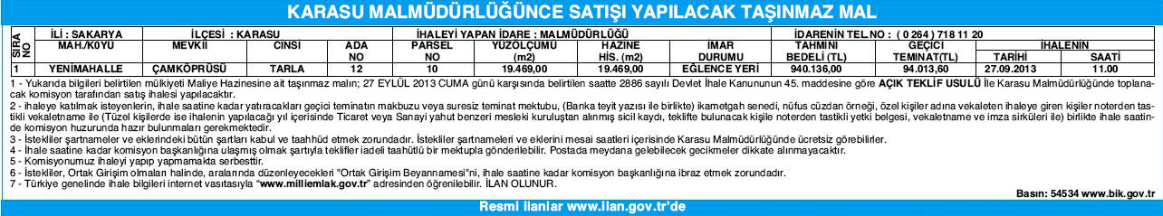 Sakarya Karasu Malmüdürlüğü 940 bin 136 lira bedelle eğlence yeri satıyor. Geçici teminat bedeli 94 bin 13 lira olan taşınmazın ihalesi 27 Eylül 2013 günü saat 11.00'de Karasu Malmüdürlüğü'nde gerçekleştirilecek.