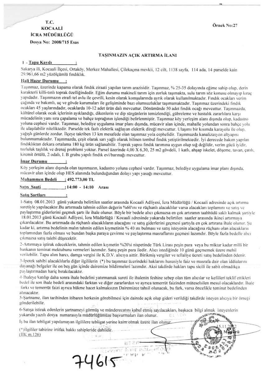 Sakarya Kocaali İcra Müdürlüğü, 29 bin 961 metrekarelik fındık tarlasını 492 bin 773 bin lira tahmini bedelle satışa çıkardı