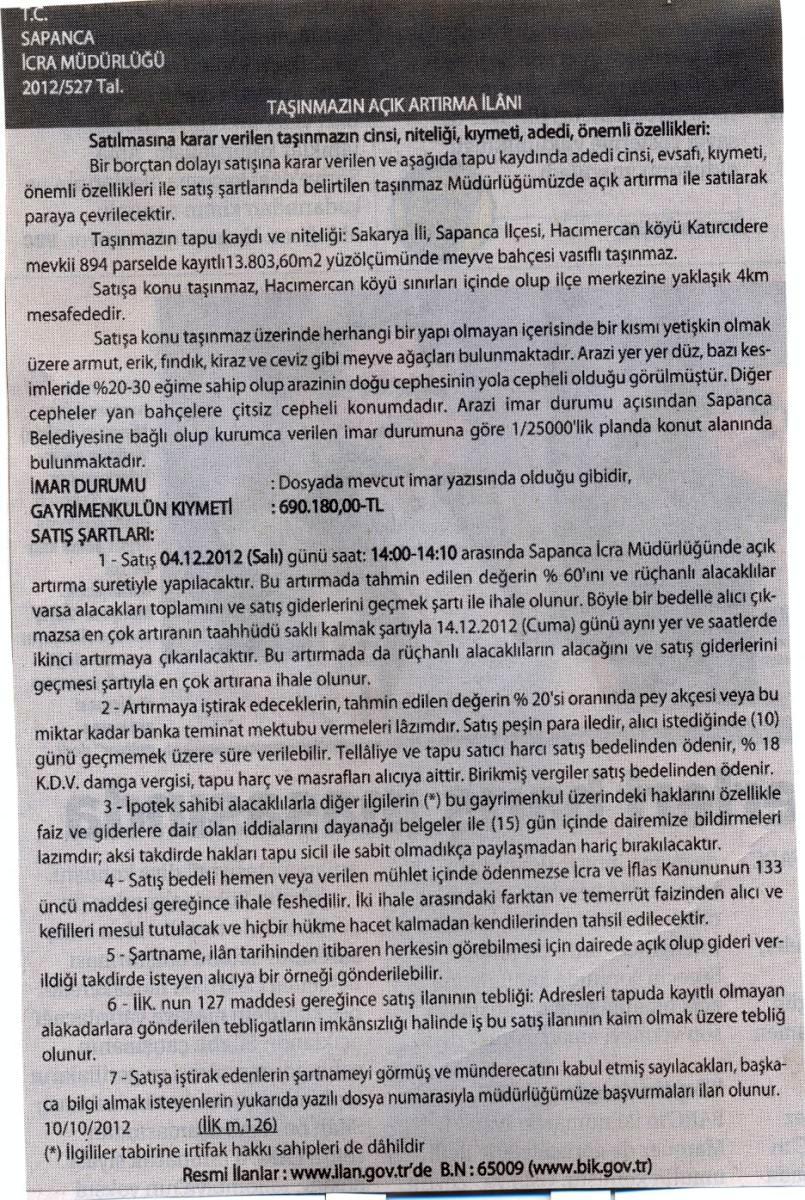 Sapanca İcra Müdürlüğü, Hacımercan Köyü sınırları içerisinde kalan 13 bin 803 metrekarelik meyve bahçesini 690 bin 180 lira tahmini bedelle satışa çıkardı. Aynı zamanda konut imarı da bulunan arsanın ihalesi 4 Aralık 2012 Salı günü saat 14.00 ile 14.10 arası Sapanca İcra Müdürlüğü'nde yapılacak. Alıcı çıkmaması durumunda ikinci satış 14 Aralık 2012 Cuma günü aynı yer ve saatte yapılacak.
