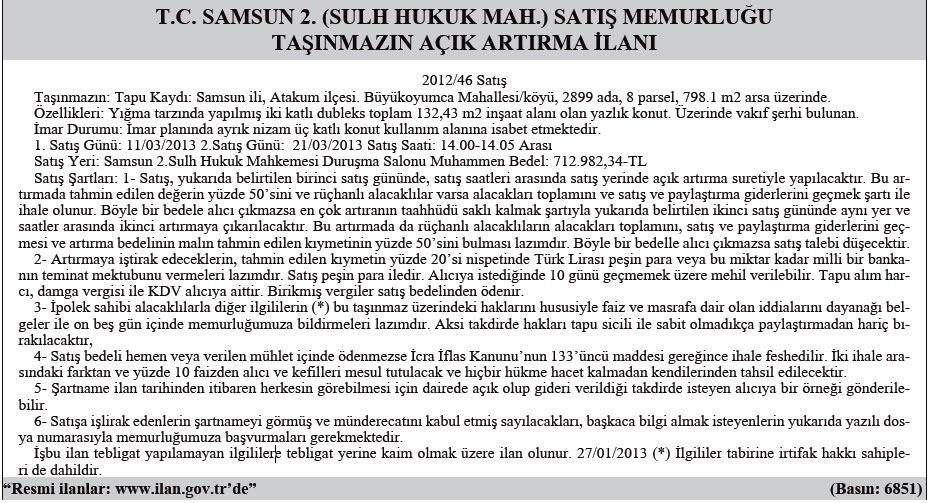 İhale, 11.03.2013 tarihinde saat 14.00'te Samsun 2. Sulh Hukuk Mahkemesi Duruşma Salonu'nda yapılacak.