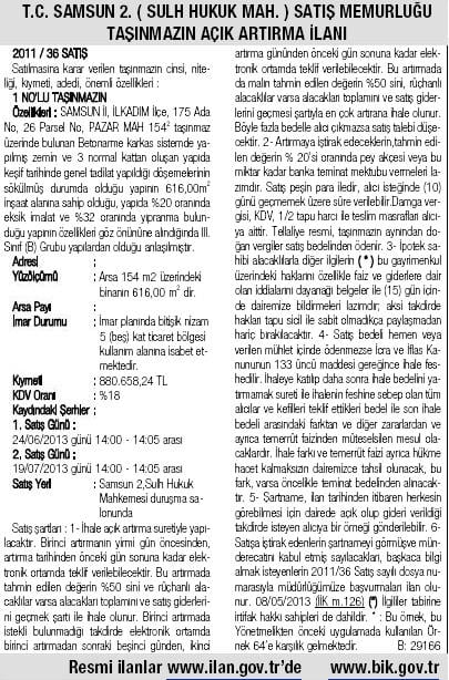 Samsun 2. Satış Memurluğu, İlkadım'da 616 metrekare inşaat alanına sahip olan yapıyı satışa çıkardı. Arsa alanı 154 metrekare olan taşınmazın tahmini bedeli 880 bin 658 lira, KDV oranı ise yüzde 18 olarak belirlendi. İhale 24 Haziran 2013 günü saat 14.00 ile 14.05 arası Samsun 2. Sulh Hukuk Mahkemesi'nde yapılacak. Alıcı çıkmaması durumunda ikinci satış 19 Temmuz 2013 günü aynı yer ve saatte gerçekleştirilecek.
