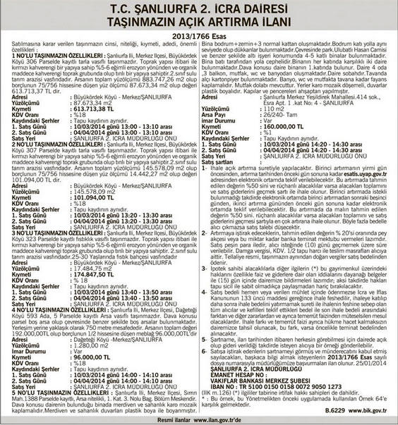 Şanlıurfa İcra Dairesi'nin, Büyükördek Köyü'nde satışa sunduğu gayrimenkullerin toplam tahmini bedelleri 1 milyon 145 bin 654 lira olarak belirlendi. Şanlurfa'da satışa konu olan gayrimenkullerin ihalesi 10 Mart 2014 günü saat 13:00'te Şanlıurfa İcra Müdürlüğü önünde gerçekleştirilecek. Alıcı çıkmaması durumunda ikinci satışlar 4 Nisan 2014 günü aynı yer ve saatte tekrarlanacak.