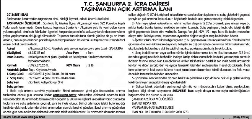 Şanlıurfa 2. İcra Dairesi'nin Akçamescit Köyü'nde satışa çıkardığı 8 bin 957 metrekare yüzölçüme sahip arsanın tahmini fiyatı 1 milyon 925 bin 875 lira olarak belirlendi. Söz konusu arsanın ihalesi 2 Haziran 2014 günü saat 10:30 ile 10:40 arası Şanlıurfa Adliye Sarayı'nda açık artırma yöntemiyle gerçekleşecek. Alıcı çıkmaması durumunda ikinci satış 27 Haziran 2014 günü aynı yer ve saatte tekrarlanacak.