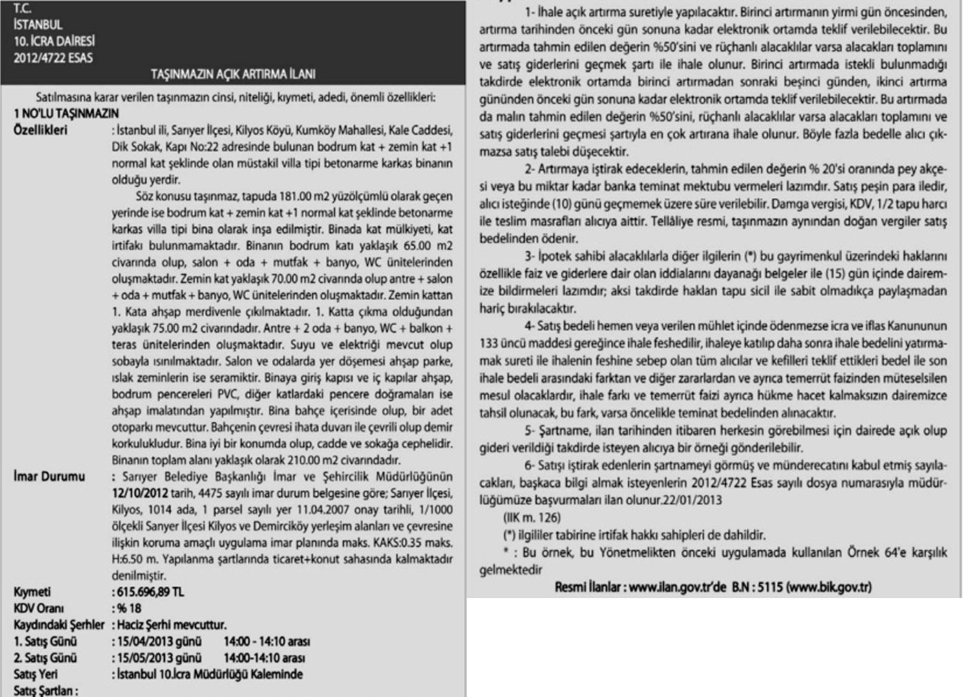 İstanbul 10. İcra Dairesi, Sarıyer ilçesi, Kilyos Köyü, Kumköy Mahallesi, Kale Caddesi, Dik Sokak, Kapı No: 22 adresinde bulunan bodrum kat+zemin kat+1 normal kat şeklinde olan müstakil villa tipi betonarme karkas bina için ihale düzenledi. Taşınmazın muhammen bedeli 615 bin 696 TL olarak belirlendi. İhale, 15.04.2013 günü saat 14.00'te gerçekleşecek.