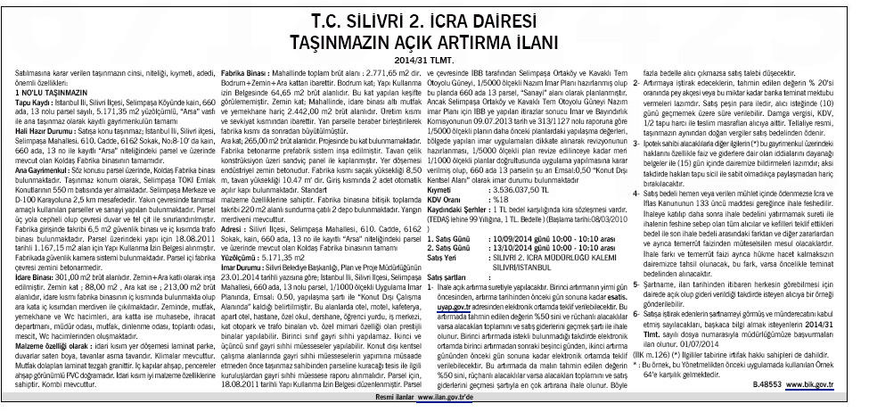 Silivri 2. İcra Dairesi, Silivri Selimpaşa Köyü'nde yer alan arsayı 3 milyon 536 bin 37 lira bedel ile satacak. Söz konusu gayrimenkul 5 bin 171 metrekare yüzölçümünde olup ihalesi 10 Eylül 2014 günü saat 10.00-10.10 arasında Silivri 2. İcra Müdürlüğü'nde yapılacak. Alıcı çıkmaması durumunda ise 2. Satış 13 Ekim 2014 günü belirtilen saat aralığında gerçekleştirilecek.