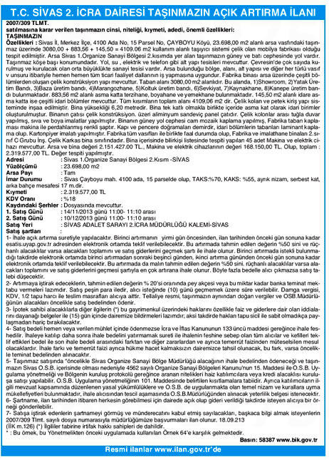 Sivas 2. İcra Dairesi Çayboyu Köyü’nde 23 bin 698 metrekare arsa üzerinde yer alan çelik mobilya fabrikasını satışa çıkardığını açıkladı