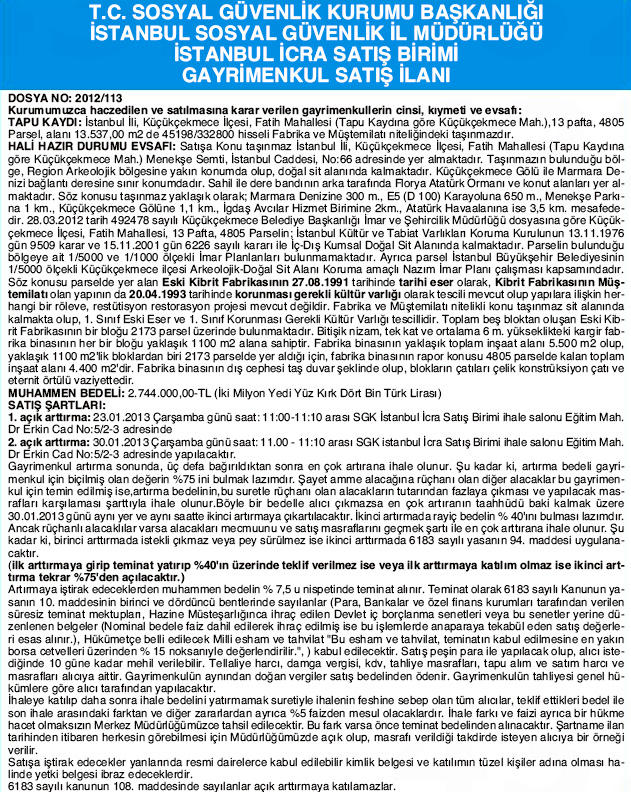 Sosyal Güvenlik Kurumu Başkanlığı İstanbul Sosyal Güvenlik İl Müdürlüğü, Küçükçekmece'de bulunan eski kibrit fabrikasını satışa çıkardı. 13 bin 537 metrekarelik alan üzerinde yer alan yapılar korunması gereken kültür varlığı kapsamında yer alıyor. Marmara Denizi'ne 300 metre, Menekşe Parkı'na 1 kilometre, Küçükçekmece Gölü'ne 1,1 kilometre ve İGDAŞ Avcılar Hizmet Birimi'ne 2 kilometre mesafede yer alan yapının ihalesi 23 Ocak 2013 Çarşamba günü saat 11.00 ile 11.10 arası SGK İstanbul İcra Satış Birimi'nde gerçekleşecek. Alıcı çıkmaması durumunda ise ikinci satış 30 Ocak 2013 aynı yer ve saatte gerçekleşecek.