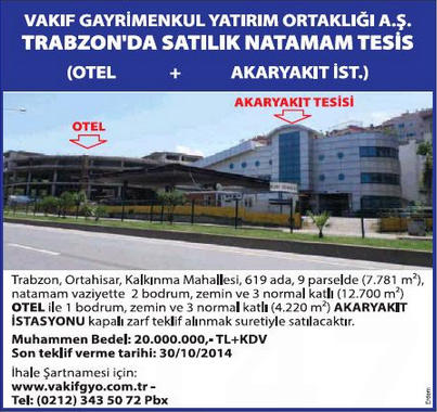 Vakıf Gayrimenkul Yatırım Ortaklığı, Ortahisar Kalkınma Mahallesi'nde yer alan 619 ada, 9 parseldeki 7 bin 781 metrekare natamam durumdaki 2 bodrum, zemin ve 3 normal katlı 12 bin 700 metrekarelik otel ile 1 bodrum, zemin ve 3 normal katlı 4 bin 220 metrekare akaryakıt istasyonunu kapalı teklif yöntemiyle satışa sundu. Söz konusu otel ve akaryakıt istasyonundan oluşan tesisin tahmini bedeli 20 milyon lira olarak belirlendi. Son tekif verme tarihi 30 Ekim 2014 günü olarak açıklandı.