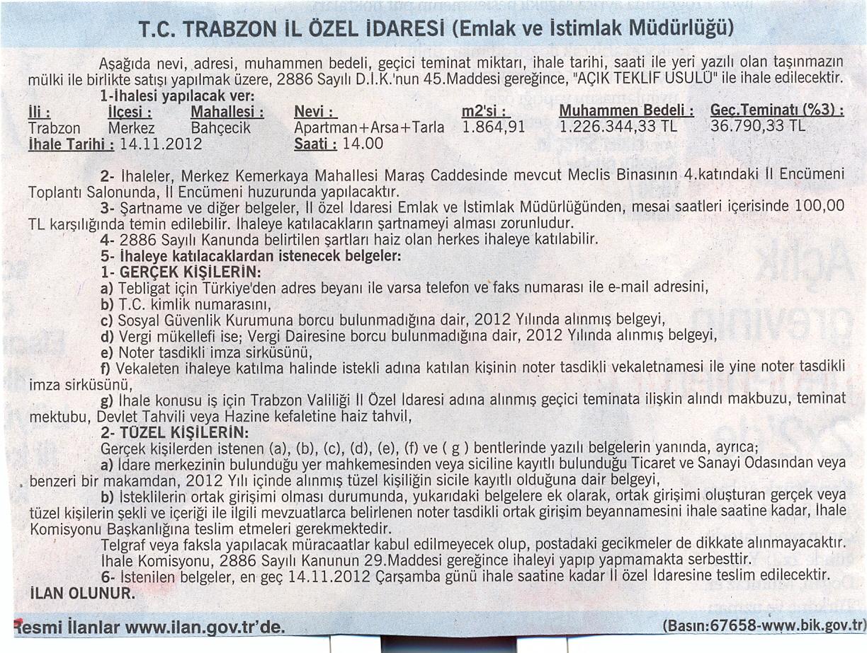 Trabzon İl Özel İdaresi'nden yapılan açıklamaya göre Bahçecik Mahallesi'ndeki taşınmaz için 1 milyon 226 bin 344 lira tahmini fiyat, 36 bin 790 lira da geçici teminat tayin edildi. İhale 14 Kasım 2012 tarihinde saat 14.00'te Kemerkaya Mahallesi Maraş Caddesi üzerinde yer alan Meclis Binası'nda gerçekleştirilecek.