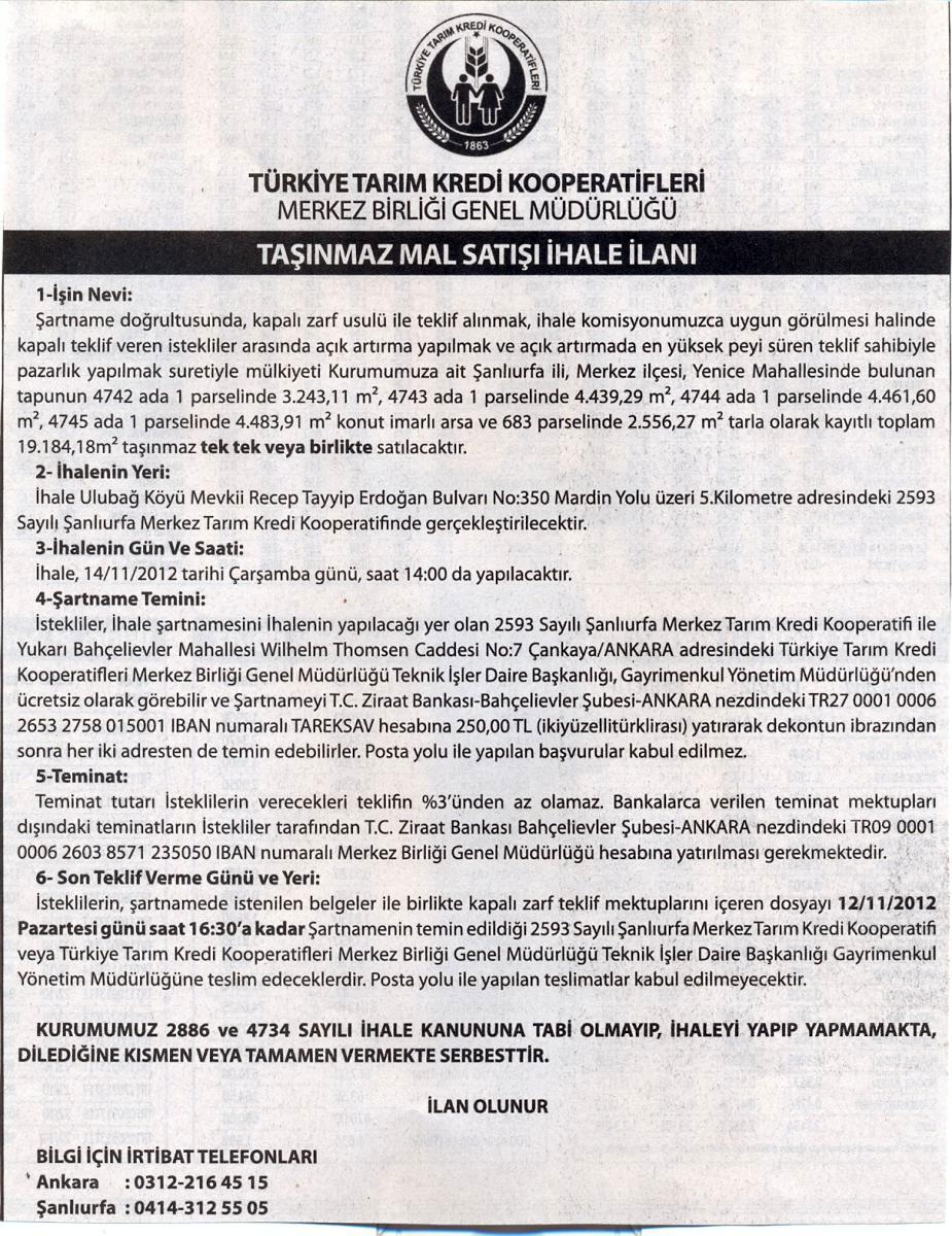 Türkiye Tarım Kredi Kooperatifleri, Şanlıurfa Yenice Mahallesi'nde 5 parsel arsayı satışa çıkardı. 2 bin 556 metrekare ile 4 bin 489 metrekare arası alana sahip arsaların toplam büyüklüğü 19 bin 184 metrekare. Satışa çıkarılan arsaların ihalesi 14 Kasım 2012 günü saat 14.00'te Şanlıurfa Merkez TTKK adresinde yapılacak.