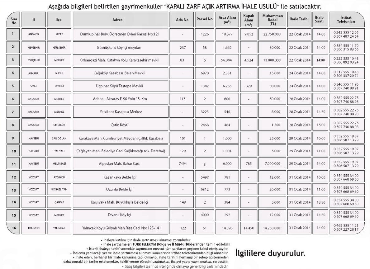 Türk Telekom Antalya, Nevşehir, Eskişehir, Ankara, Sivas, Aksaray, Kayseri, Yozgat ve Trabzon olmak üzere 11 ilde 16 arsayı satışa çıkardı