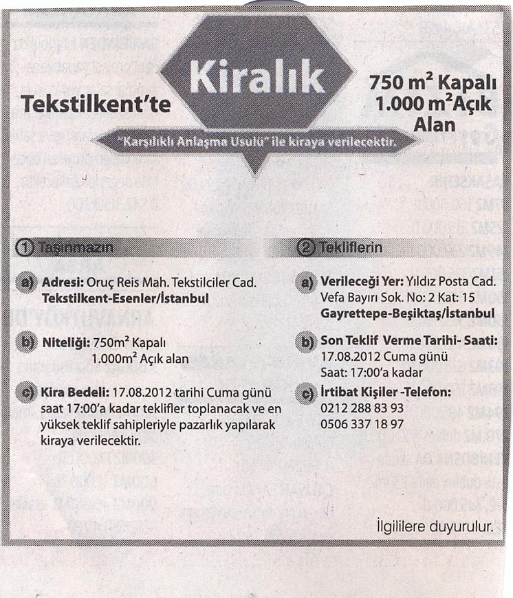 Türk Telekom, Tekstilkent içerisinde yer alan, 750 metrekarelik kapalı ve 1000 metrekarelik açık alana sahip dükkanı kiraya verecek. Karşılıklı anlama usulü gerçekleşecek kiralamada tekliflerin en geç 17 Ağustos 2012 günü saat 17.00'a kadar Türk Telekom Gayrettepe binasına verilmesi gerekiyor. Esenler bölgesinde yer alan Tekstilkent'teki işyerine kapalı ve açık olmak üzere toplam 1750 metrekarelik alandan meydana geliyor.