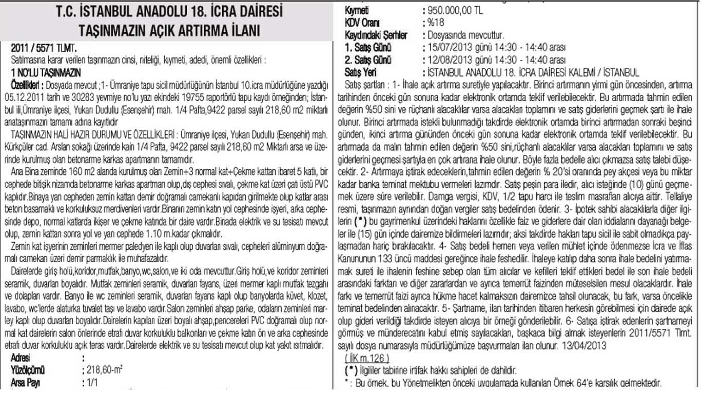 İstanbul Anadolu 18. İcra Dairesi, İstanbul ili, Ümraniye ilçesi, Yukarı Dudullu (Esenşehir) Mahallesi'nde bulunan betonarme karkas apartmanın tamamı ihale ile satılacak. Taşınmazın muhammen bedeli 950 bin lira olarak belirlendi. İhale, 15.07.2013 tarihinde saat 14:30'da İstabul Anadolu 18. İcra Dairesi Kalemi/İstanbul adresinde yapılacak.