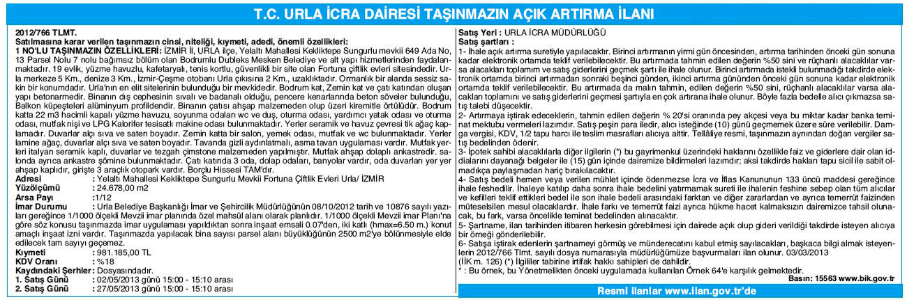 Urla İcra Dairesi, İzmir ili, Urla ilçesi, Yelaltı Mahallesi, Kekliktepe Sungurlu mevkiinde bulunan Fortuna Çiftlik Evleri Sitesi'ndeki dubleks konutu ihale ile satacak. Taşınmazın muhammen bedeli 981 bin 185 TL olarak belirlendi. İhale, 02.05.2013 tarihinde saat 15.00'te Urla İcra Müdürlüğü'nde yapılacak.