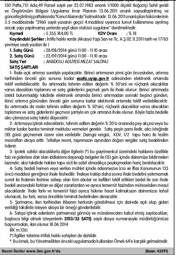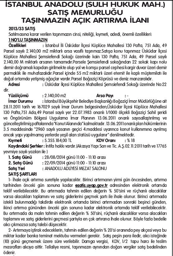 Üsküdar Küplüce Mahallesi'nde yer alan arsa niteliğindeki taşınmaz satışa çıkarıldı. Söz konusu 2 bin 140 metrekare yüzölçümlü taşınmazın muhammen bedeli 5 milyon 355 bin 184 lira olup ihalesi 28 Ağustos 2014 günü saat 11.00-11.10 arasında İstanbul Anadolu Adliyesi'nde gerçekleştirilecek. Arsa için alıcı çıkmaması durumunda ise 2. Satış 22 Eylül 2014 günü belirtilen saat aralığında düzenlenecek.